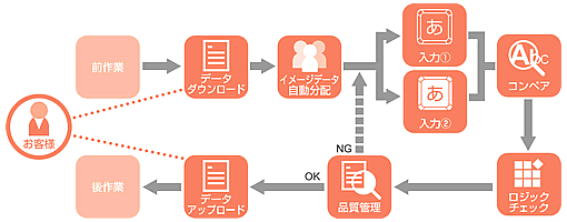 一般的な業務の流れは、お客様でスキャン、データ化した原票の内容をFTP通信によりお受け取りし、処理終了後FTPにて納品をしております。